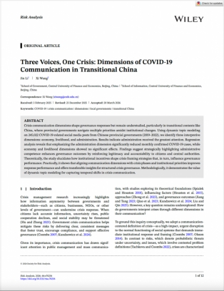 发表于Risk Analysis的论文《Three Voices, One Crisis: Dimensions of COVID-19 Communication in Transitional China》,以中国省级政府在新冠疫情期间发布的政务微博为研究对象,识别出经济、民生与行政三类危机沟通维度,并分析其对治理绩效的影响。研究发现,强化行政维度的沟通呈现有助于提升危机治理效果。论文合作者为我校信息学院副院长王熙教授。Risk Analysis是国际风险分析协会(Society for Risk Analysis, SRA)的官方期刊,JCR1区、ABS4级、FMS A类期刊,在风险治理与公共政策领域具有重要影响力。