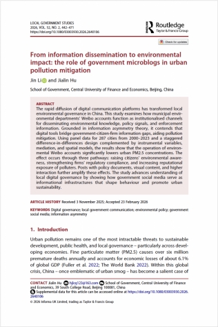 发表于Local Government Studies的论文《From Information Dissemination to Environmental Impact: The Role of Government Microblogs in Urban Pollution Mitigation》,基于中国287个地级市的长期面板数据,考察了地方环保部门政务微博在城市污染治理中的作用。研究发现,环保政务微博的开通与运营能够显著降低城市污染水平,其作用主要通过缓解信息不对称、提升公众环境意识、强化企业合规行为和增强污染者声誉约束等路径实现。论文合作者为我院2022级博士生胡佳霖。Local Government Studies是地方治理研究领域的重要国际学术期刊。