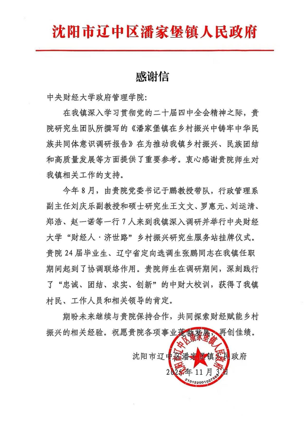 近日,沈阳市辽中区潘家堡镇人民政府特向我院发来感谢信,对我院与潘家堡镇人民政府共建中央财经大学“财经人·济世路”乡村振兴研究生服务站,开展深入实践与专题调研,并撰写的《潘家堡镇在乡村振兴中铸牢中华民族共同体意识》调研报告等工作表示高度认可与诚挚感谢。