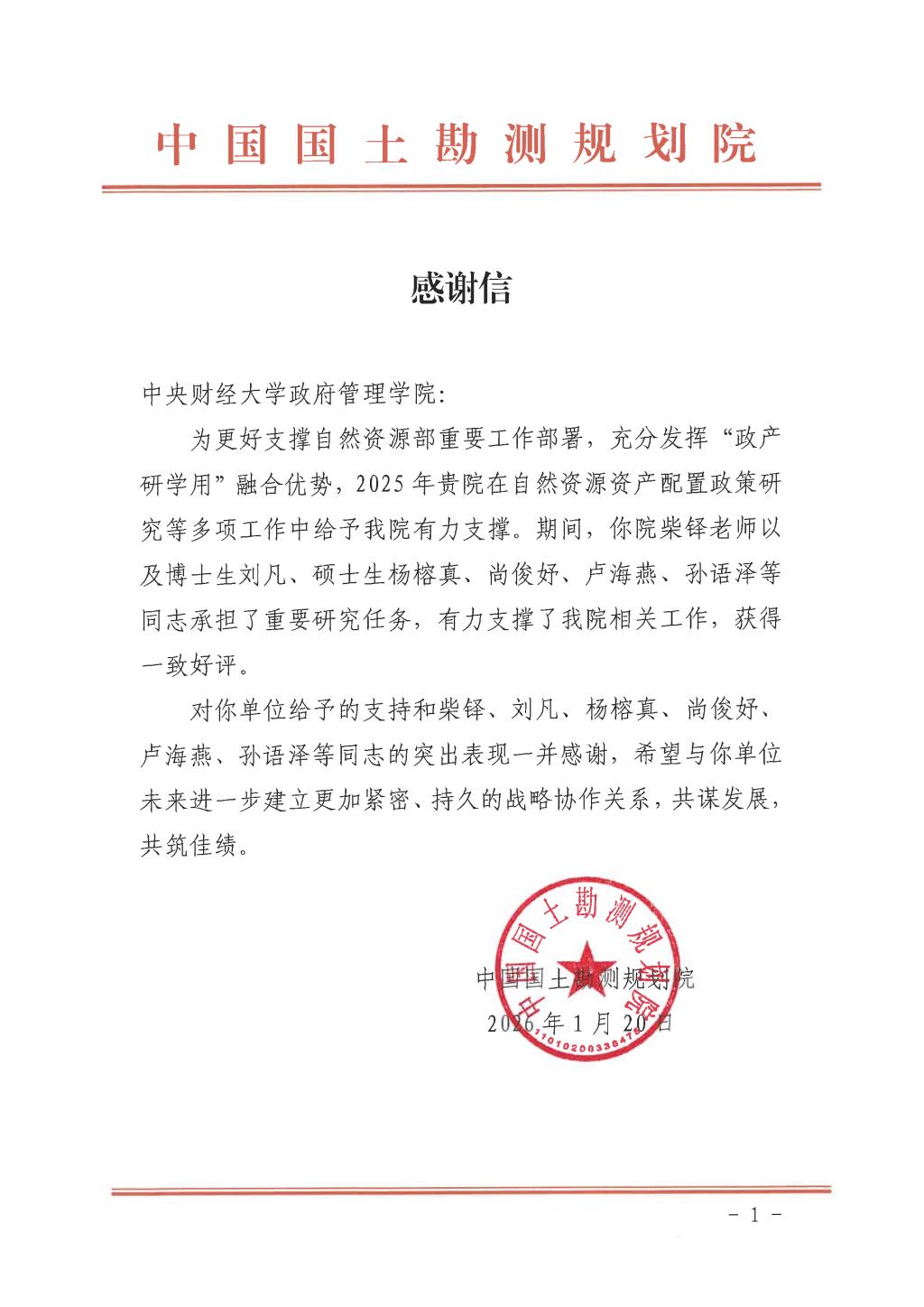 近日,中国国土勘测规划院向中央财经大学政府管理学院发来感谢信,对柴铎副教授及学生团队在自然资源资产领域的专项研究工作予以高度肯定,感谢团队为相关政策研究制定与实践推进提供的坚实智力支撑。